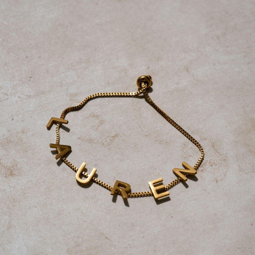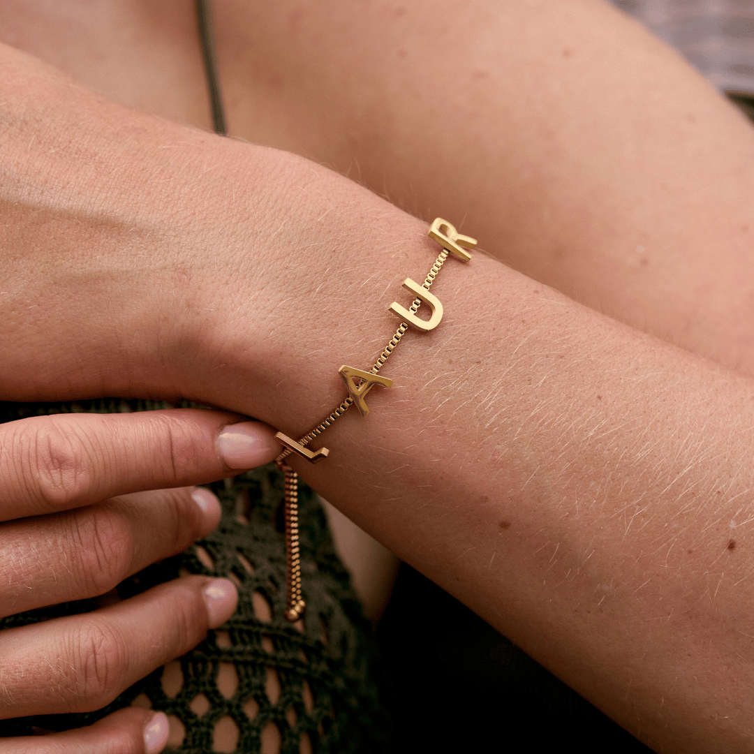 Our Custom Name Bracelet adds a sophisticated and elegant touch to any outfit. Wear it individually or stack it with our other bracelets for an on trend look.